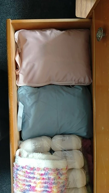 Large acrylic blanket is now stored tidily under the caravan bed .